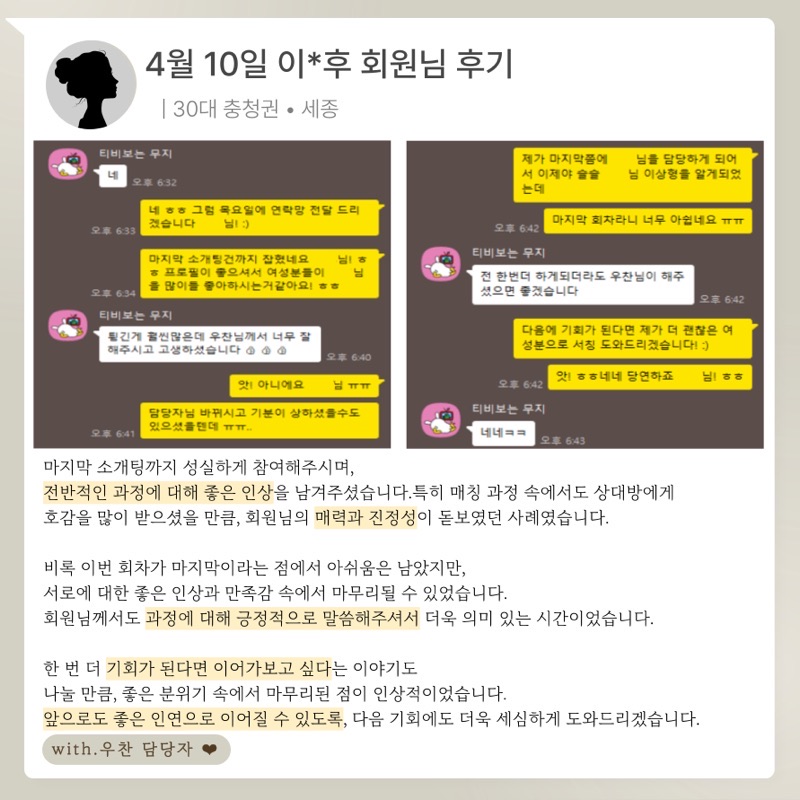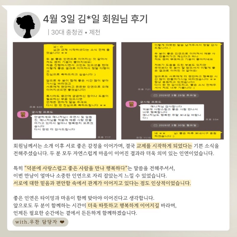 우연시는 신뢰할 수 있는 매칭을 위해 실제로 만남이 이어진 분들의 후기만을 공개합니다.